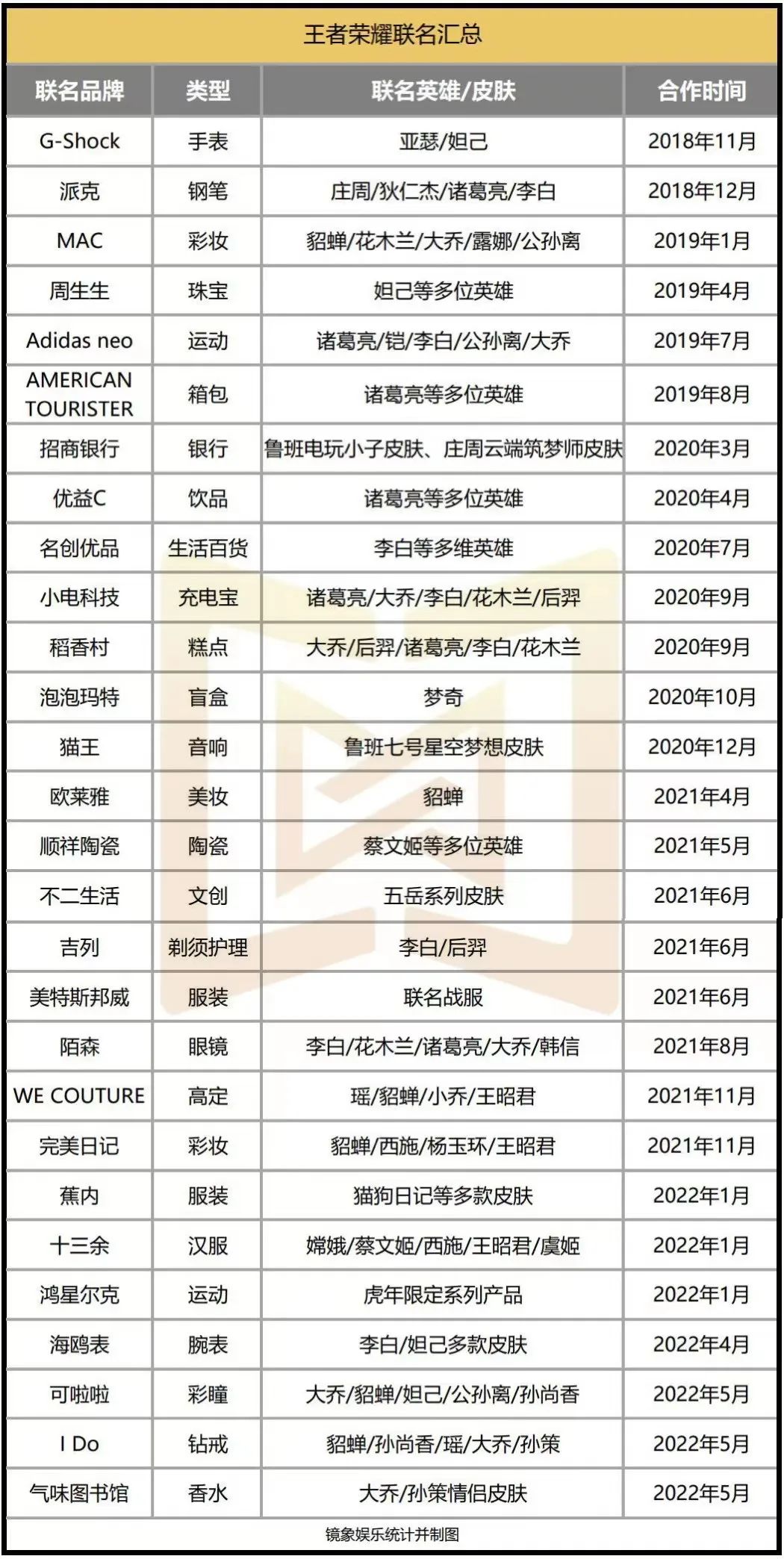在王者的历史中,自带联名诞生的皮肤不多,不过,联名这件事王者并不陌生。2018年年底至今,王者联名品牌近30家,包含名创优品、泡泡玛特、MAC、吉列、周生生等各领域的品牌。
