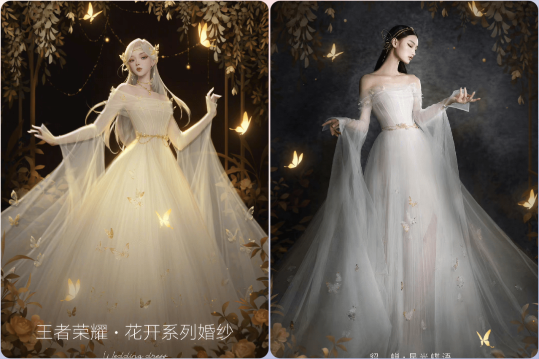 不过,相比于玩家们对口红这种低价快消品的高接受度,王者联名高定婚纱推出后外界反应明显冷淡,并提出了诸多质疑,比如设计感较差、智商税、溢价严重等等。从玩家探讨来看,对于婚纱这种“一次性产品”而言,大多数人不会冲动消费,倒是不少照相馆推出王者婚纱风格的艺术照后,吸引了一大波玩家打卡。