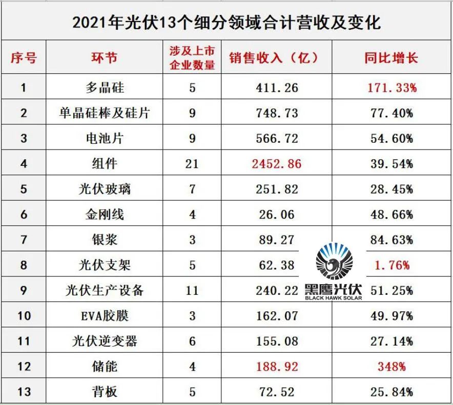 黑鹰团队梳理所有光伏上市企业13个不同环节业务营收及毛利率水平,可以发现,包括多晶硅、硅片、电池、组件、设备、逆变器等几乎所有环节,过往一年中整体营收都实现大幅增长,但不同环节的“赚钱能力”千差万别。