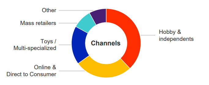 Asmodee的产品主要通过专门的兴趣消费店铺(比如桌游店、漫画书店)销售,其次是电商与自家直接面向消费者的渠道。