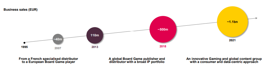 Asmodee于1995年成立于法国,1998年开始第一起收购,并购了Jungle Speed,此后不断通过收购来获取人才和IP,营收一路上涨。
