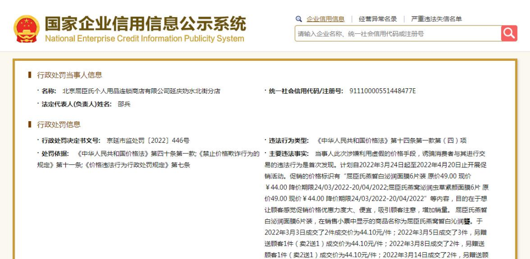根据国家企业信用信息公示系统公示的行政处罚信息,北京屈臣氏个人用品连锁商店有限公司延庆妫水北街分店(下称屈臣氏北京延庆妫水北街分店)自2022年3月24日起至2022年4月20日止开展促销活动。促销的价格标识有“屈臣氏燕皙白泌润面膜(6片装)原价49元、现价44元;屈臣氏燕窝泌润虫草紧颜面膜(6片装)原价49元、现价44元,降价期限为2022年3月24日起至2022年4月20日”等内容,目的在于想让顾客感觉促销价格优惠力度大、便宜,吸引顾客注意,增加销量。