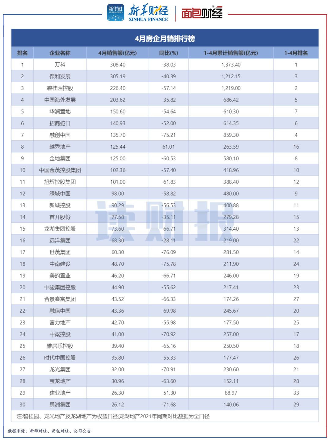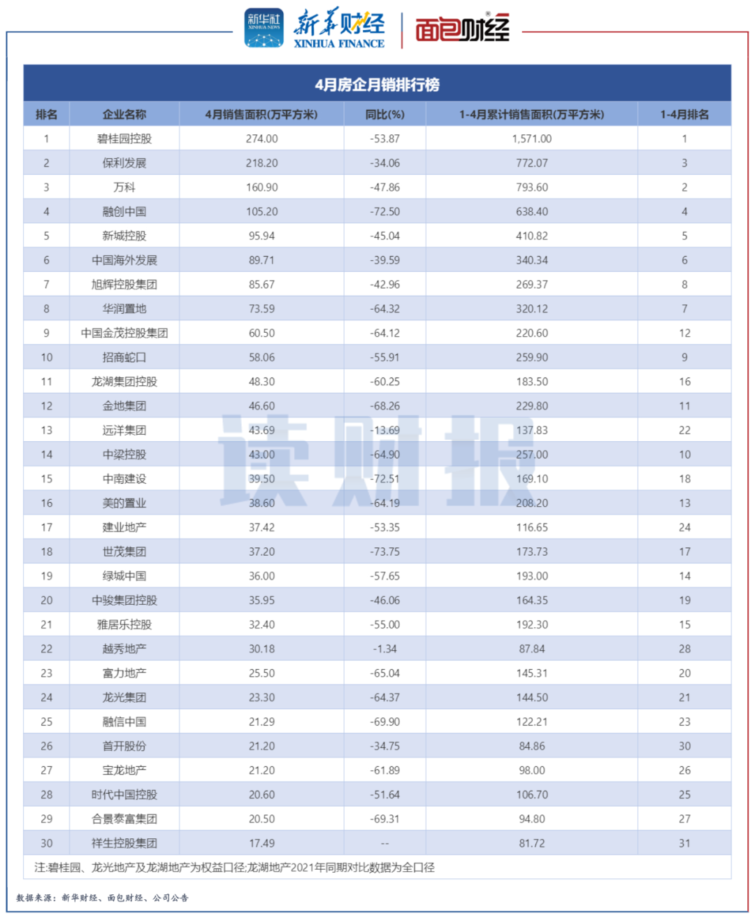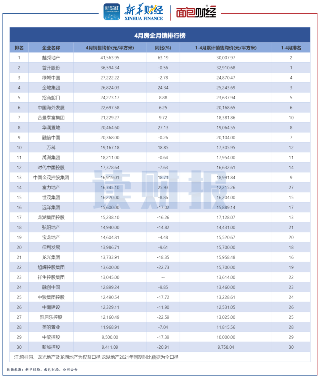 主流上市房企2022年4月销售数据已经披露完成。新华财经和面包财经研究员在剔除部分数据披露不全的上市房企后,以沪、深、港三大股票交易所39家主要上市房企为样本,分别统计销售金额、销售面积以及销售均价排名前三十的企业。
