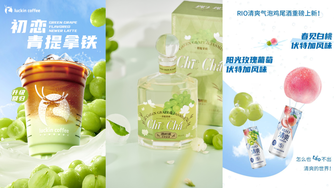此外,青提在酒精饮料中同样蕴含发展潜力。酒时浪洞察女性轻酒饮市场,以“香水瓶里的微醺茶”为概念,推出青提茉莉冷萃茶酒。RIO上新阳光玫瑰葡萄伏特加风味气泡鸡尾酒,为消费者带来多元味蕾体验。