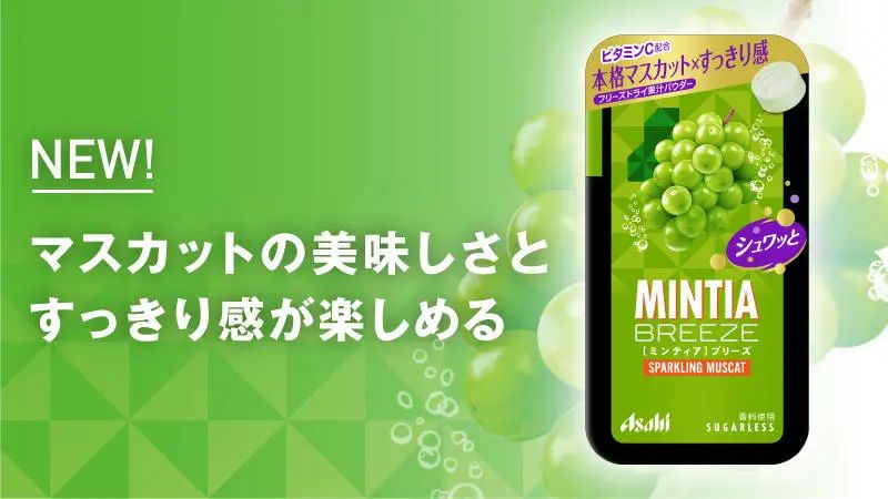 朝日以青提果汁冻干后的纯正果粉为主要原料,在2021年11月推出一款青提风味无糖薄荷糖(ミンティアブリーズ スパークリングマスカット)。无糖配方,0糖低脂的同时保持青提原有果味。滋味缓释技术,清新口气,清凉持久。特别添加维生素C。包装设计上青提、气泡等元素的应用,为产品增添清爽视觉感受。