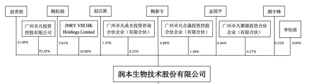 目前该公司的股权架构为:广州卓凡投资控股有限公司(下文简称“卓凡投控”)持有公司52.45%的股份,赵贵钦和鲍松娟夫妇分别直接持有公司21.09%和5.61%的股份。此外,赵贵钦夫妇持有卓凡投控100%股权,再加上他们持有的广州卓凡承光投资咨询合伙企业、广州卓凡合晟投资控股合伙企业和广州卓凡聚源投资合伙企业名下的股权,这对夫妇直接和间接合计持有该公司的股权比例超过80%,是这家公司的实际控制人。