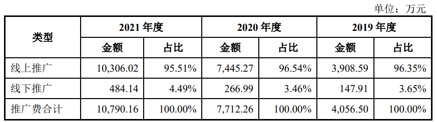 但与之对应地,该公司在上述电商平台的营销费用也随着销售额逐年攀升。2019~2021年,润本股份的推广费金额分别为4056.5万元、7712.26万元和1.07亿元,占营业收入的比例分别为14.56%、17.42%、18.54%。