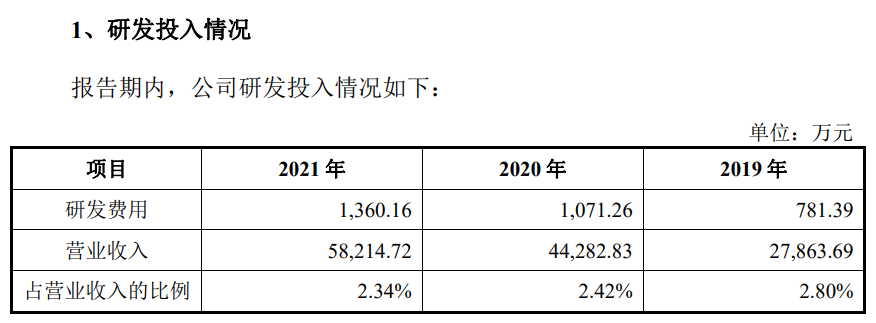 此外,报告期内,该公司的研发费用分别为781.39万元、1071.26万元和1360.16万元,研发费用率分别为2.8%、2.42%和2.34%,有逐年降低之势。