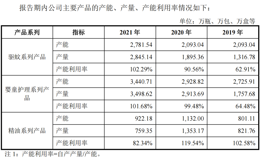 同时,润本在婴童护理系列产品的产能、产量及产能利用率也逐年上涨。2019—2021年,其产能利用率分别达64.48%、99.48%、101.68%。除了在2021年略低于驱蚊系列产品102.29%的产能利用率,婴童护理系列产品在产能及产能利用率上均居润本三大核心业务之首。
