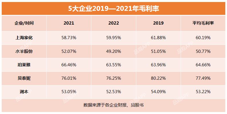 在毛利率方面,润本低于一众美妆上市企业。期内,其三年平均毛利率为53.22%,而珀莱雅、上海家化、贝泰妮的三年平均毛利率均超60%,其中,贝泰妮的平均毛利率更是达到77.49%。