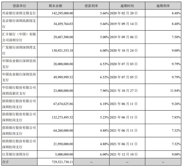 2021年年报显示,新纶新材的已逾期未偿还的短期借款总额约7.30亿元,其中余额比较大的借款有2020年2月20日逾期的1.42亿元,2020年10月24日逾期的1.31亿元,2021年6月11日逾期的1.32亿元。