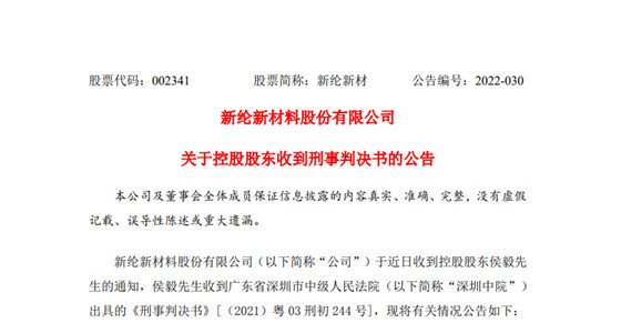 2022年4月15日新纶新材发布公告称,控股股东侯毅收到法院出具的《刑事判决书》,判决书内容为:被告人侯毅犯违规披露重要信息罪,判处有期徒刑一年六个月,缓刑三年,并处罚金人民币一百万元。