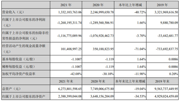 由于巨额亏损,2021年年末归属于上市公司股东的净资产23.88亿元和上一年年末相比,出现了34.53%的较大幅度“缩水”,并且不足2019年年末金额49.29亿元的一半。
