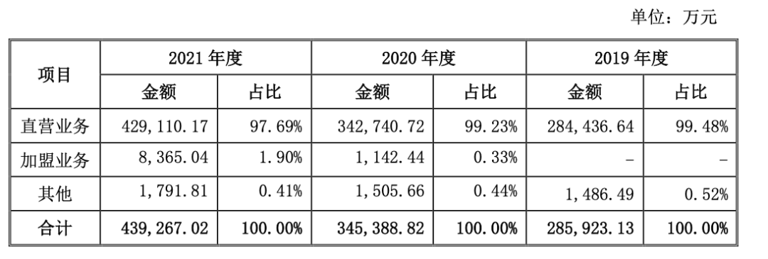 截至2021年底,老乡鸡拥有直营门店991家、加盟门店82家,共计1073家门店。主要以直营门店的销售业务为主,2021年,老乡鸡直营业务收入42.91亿元,占总收入的97.69%,加盟业务收入0.84亿元,占比1.9%,其他零星销售0.18亿元,占比0.41%。