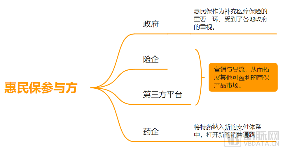 政府、险企、第三方健康险科技或服务商、药企等组成了惠民保的多个参与方,这也是惠民保能够迅速上马并持续运维的关键所在。
