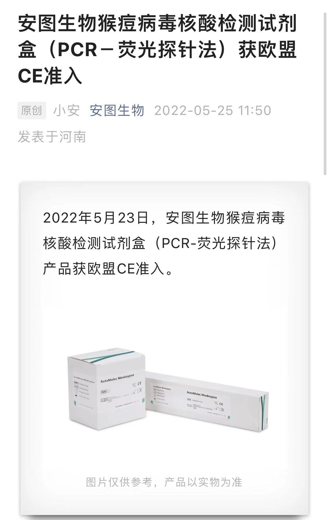 据安图生物5月25日官微消息,5月23日,安图生物猴痘病毒核酸检测试剂盒(PCR-荧光探针法)产品获欧盟CE准入。