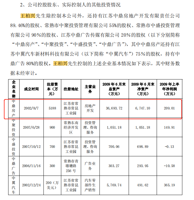 界面新闻记者发现,中利集团2009年的招股书显示,王柏兴持有江苏中鼎房地产开发有限责任公司(下称中鼎房产) 89.46%的股权。