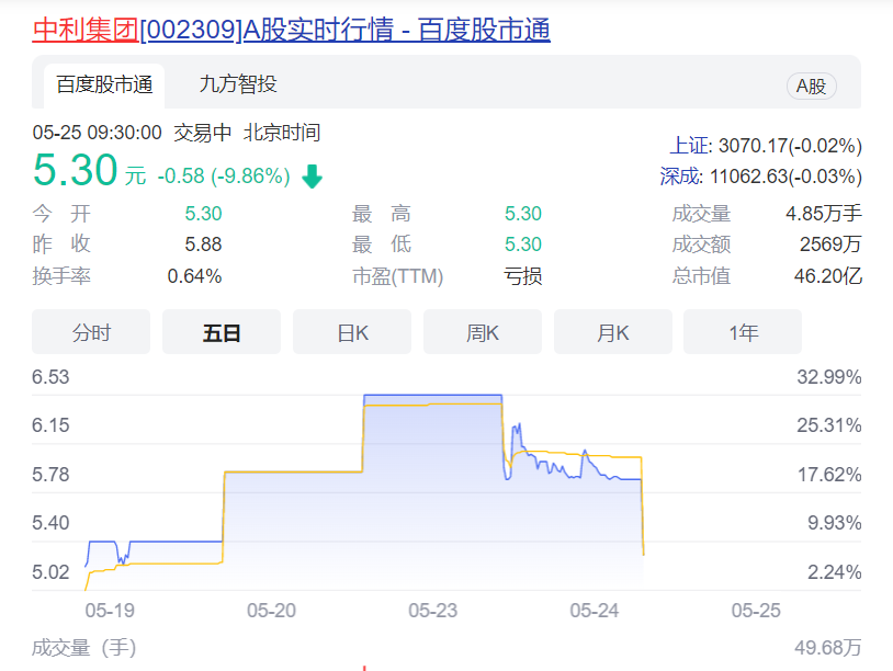 在连续五个交易日涨停后,5月24日中利集团(002309.SZ)大跌9.95%,5月25日开盘15分钟即跳楼式大跌9.86%。当前市值达46亿元。