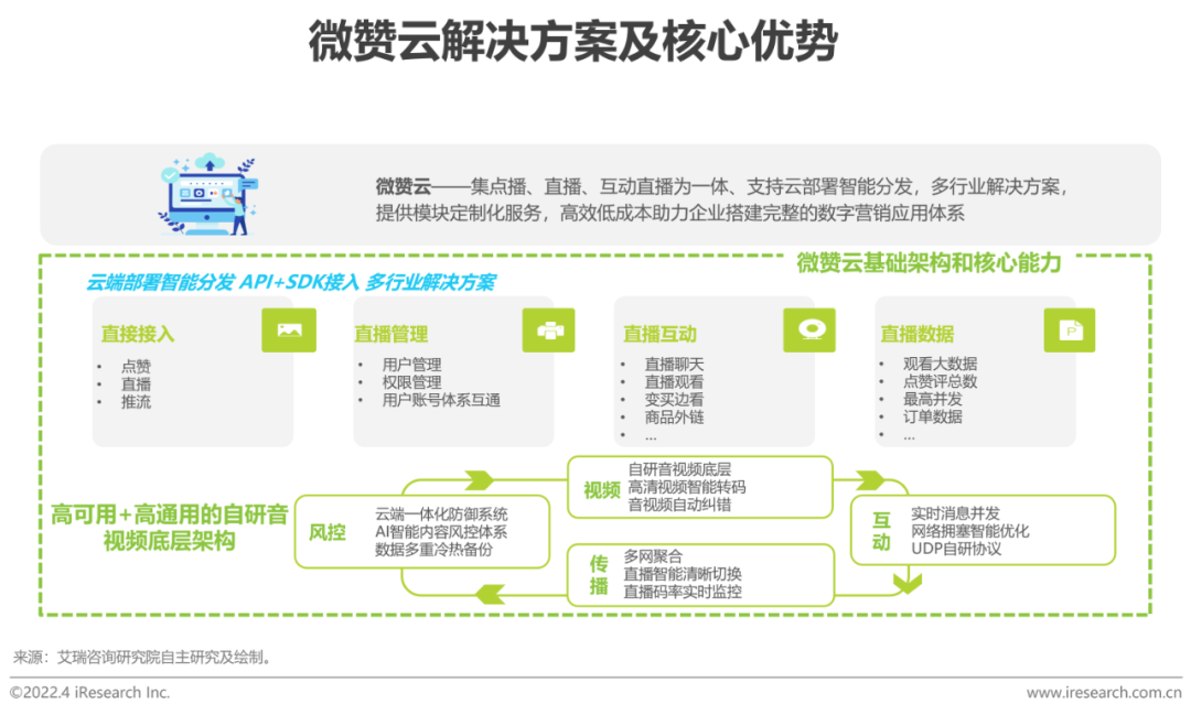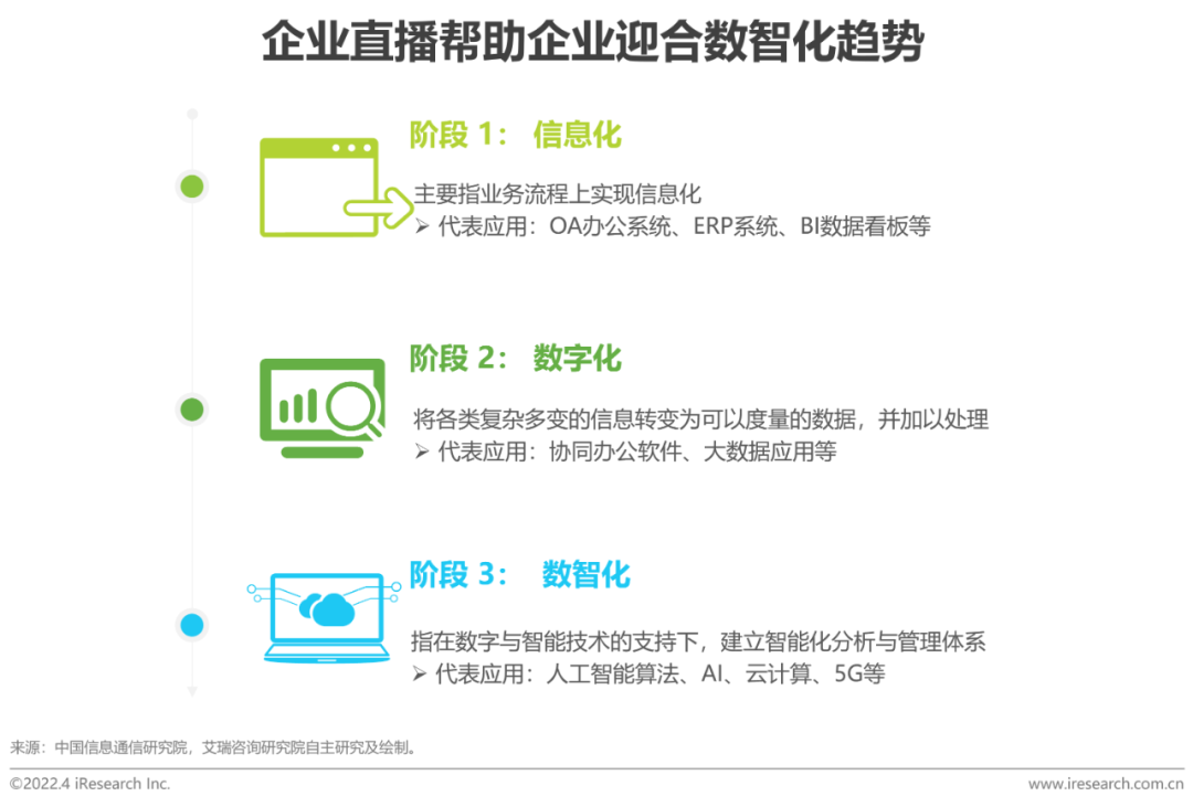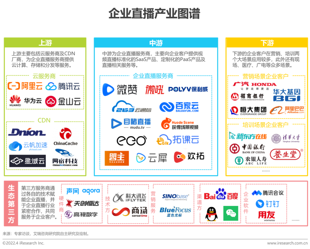 从技术端来看,传统企业上云进程加快,驱使我国云计算市场规模特别是公有云快速扩张,为打造IT数字化基础能力奠定坚实的基础。此外,大数据、边缘计算、物联网、区块链、人工智能和5G等新一代数字技术的持续发展突破,都为企业实现数字化转型提供了技术保障。从市场需求来看,全球经济、市场、商品等多维一体化发展的趋势,不断迫使企业从信息化转向数字化,并进一步向数智化方向发展。而企业直播服务可以留存并打通企业用户数据,并进一步在AI和人工智能算法的帮助下对直播运营环节提供优化的方向,进而提升运营效率,帮助企业更好的应对愈发激烈的市场竞争。