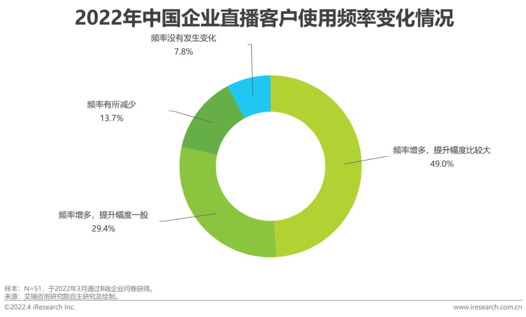 直播行业发展到今天,已经越来越多的企业认识到了常态化直播的重要性,据调研2022年有近七成的企业客户均表示其公司开展直播的频率进一步上升了,且有49.0%的企业客户表示其直播频率的提升幅度较大。究其原因,是在企业客户深度体验直播工具后,逐渐意识到企业直播这种形式可以突破地理限制,做到与客户有更深入的社交互动,实现企业与客户间的双向沟通。并且,直播服务商所进行的场景化打造,也为企业客户的营销直播提供了更多的针对性直播工具,让营销直播玩法更多元,让C端用户拥有更具沉浸感的直播体验。