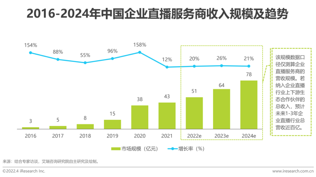 在技术发展与市场需求双重驱动下,中国企业直播市场进入深耕发展期。市场规模达到43亿元。企业客户对于直播产品的质感要求不断提升,驱动企业直播边界进一步拓展,产品、服务与技术能力进阶提升