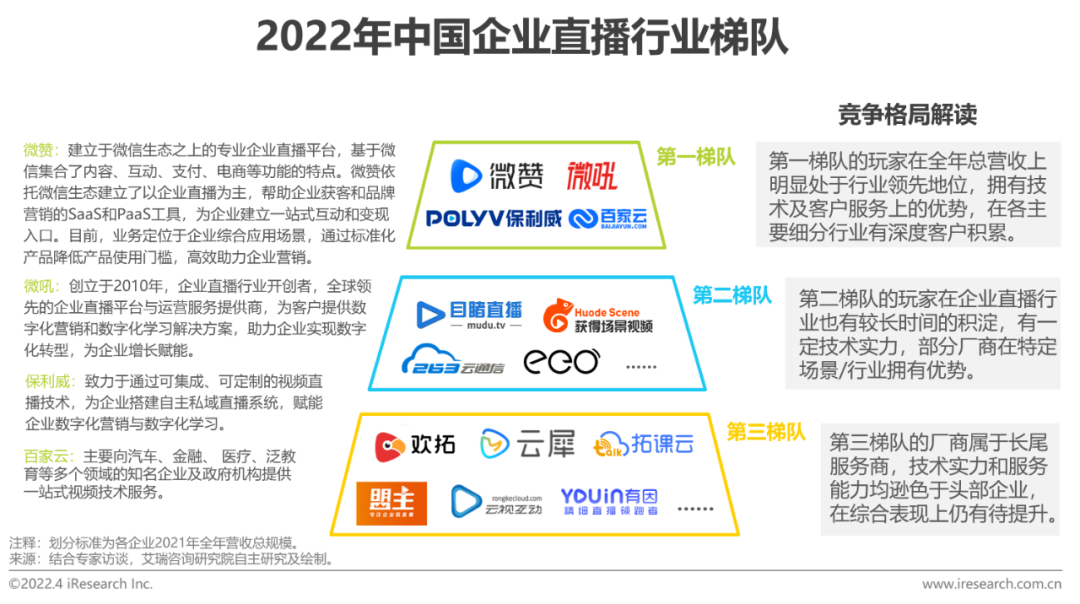 我国的企业直播服务行业,自2010年前后以企业在线会议等形式开始出现,先后经历了线上培训的热潮、电商带货的火爆和新冠疫情的加速催化。至今,企业直播服务行业的产业格局已经比较明朗,头部玩家已构建了各自的竞争壁垒。2022年我国企业直播行业可以划分为三个梯队,一是以微赞、微吼等企业组成的头部,头部服务商在技术和服务能力上都处于行业领先地位,产品覆盖较广;二是目睹、263云通信等公司组成的腰部企业,腰部企业在特定场景/行业上也拥有较强实力,但技术和能力上相对不够全面;三是欢拓、拓客云等公司组成的长尾服务商,长尾服务商的技术能力、服务能力和产品覆盖面均与前两梯队存在明显差距。