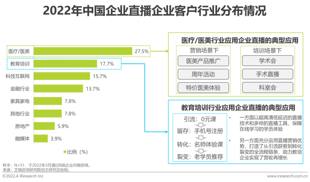 企业直播行业发展至今,企业客户的行业分布已经非常广泛。据调研,在企业直播的企业客户之中,有27.5%为医疗/医美行业客户,其次教育培训行业占比也较高,达到了17.7%。此外,科技互联网企业和金融行业使用企业直播的企业客户也较多,分布占比15.7%和13.7%。以占比最高的医疗/医美和教育培训行业为例,两个行业在营销场景和培训场景下均有较多应用。一方面,企业直播可以作为基础的线上化工具,保障行业中线上宣传或培训的应用;另一方面,在私域营销用户转化上提供从前端获客到后端转化裂变的全流程支持,为各行业的精细化运营提供抓手。