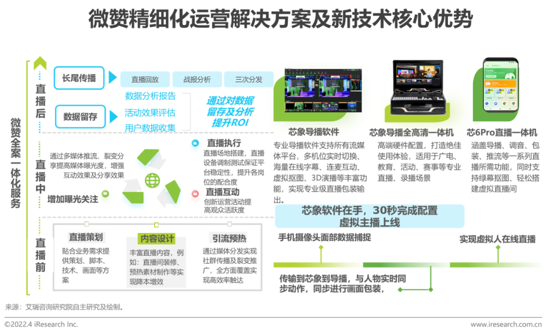 企业在直播生态的建构过程中,既要注重公域到私域的流量闭环,也要关注直播全流程的闭环。基于企业直播营销需求,微赞打造了集开播工具、内容定制、现场执行、体系搭建在内的全案一体化服务,从直播内容到品牌展示,从私域流量导入到公域引流,再到用户画像和数据粉丝,多角度、全方位服务品牌私域。此外,微赞在软硬件上不断创新,在实现专业级视频内容包装的同时推出虚拟数字人+3D演播,接轨元宇宙虚拟直播,技术创新赋能品牌营销。