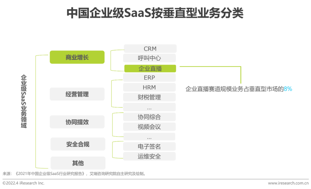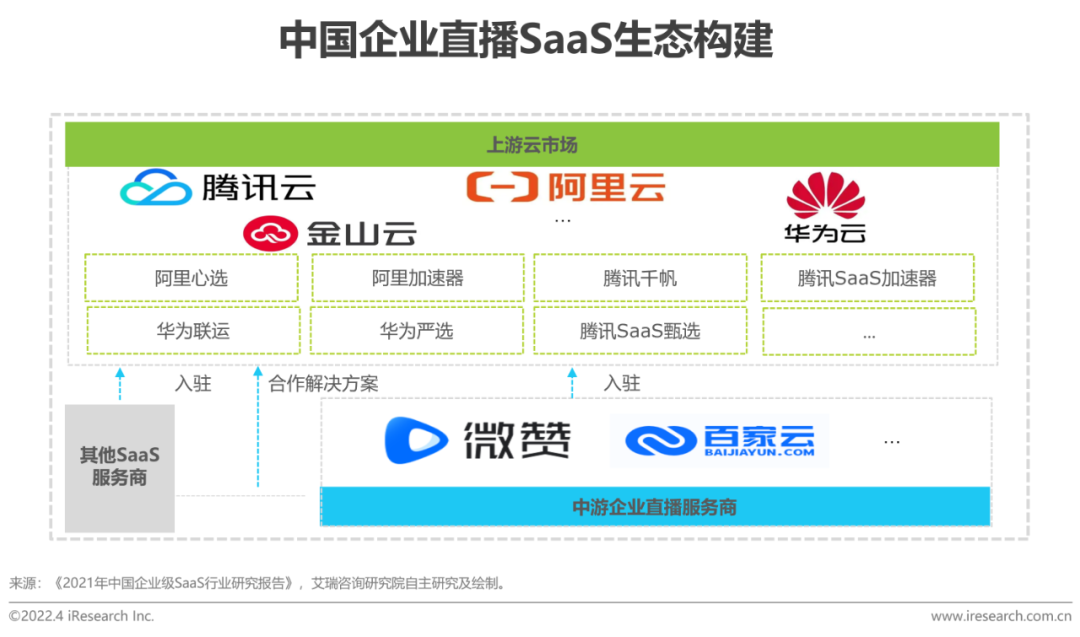 2020年以来,业务垂直型SaaS市场规模约为291.9亿元,同比增长43.1%。其中,企业直播赛道规模业务占垂直型市场8%,未来企业直播市场具有广大的发展空间。此外,中国SaaS市场也展现出特色的发展现状——SaaS直播服务商与上游云厂商互为补充、合作探索不断强化生态建设。SaaS生态化建设解决了厂商沟通、集成困难等问题,同时厂商之间能力互通满足企业客户个性化需求,提升企业客户满意度,有利于共赢的前提下,使更多企业感受数字化带来的新机遇。