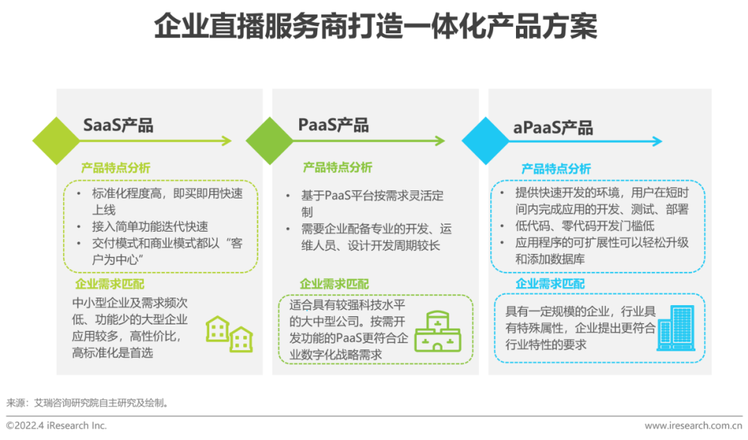 2022年伊始,企业直播产品一体化发展在企业直播服务商中扮演越来越重要的角色,三种不同模式的产品能够满足企业从标准化到个性化各种需求。企业客户在具体选择产品时,可根据自身的业务发展方向、厂商能力选择最适合自己的产品。基于标准化的SaaS产品开始向下延伸,具有个性化更加灵活的PaaS、aPaaS产品可以更好的适应具体的场景。随着未来“个性化”要求和“效率”提高对企业双向驱动作用不断加强,三种产品互通发展将成为服务大型直播客户的基础能力。