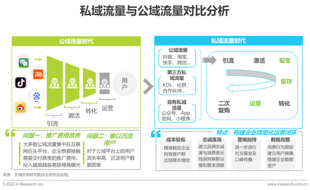 随着流量红利消失,存量时代的到来,公域流量存在的问题近些年愈发显著,获客难度大、品牌营销促活拉新困难、推广费用昂贵、沉淀用户难等问题导致流量成本上升。而私域流量成为近些年来的营销热点,相较于公域流量,私域流量具有成本低、容易建立品牌忠诚度、便于进行社交裂变及二次传播、打造用户画像建立企业数据资产等特点。私域流量群体精准度高能够最大挖掘用户价值,不仅能够降低企业营销成本,还能提升运营效率,是企业未来发展的核心选择。