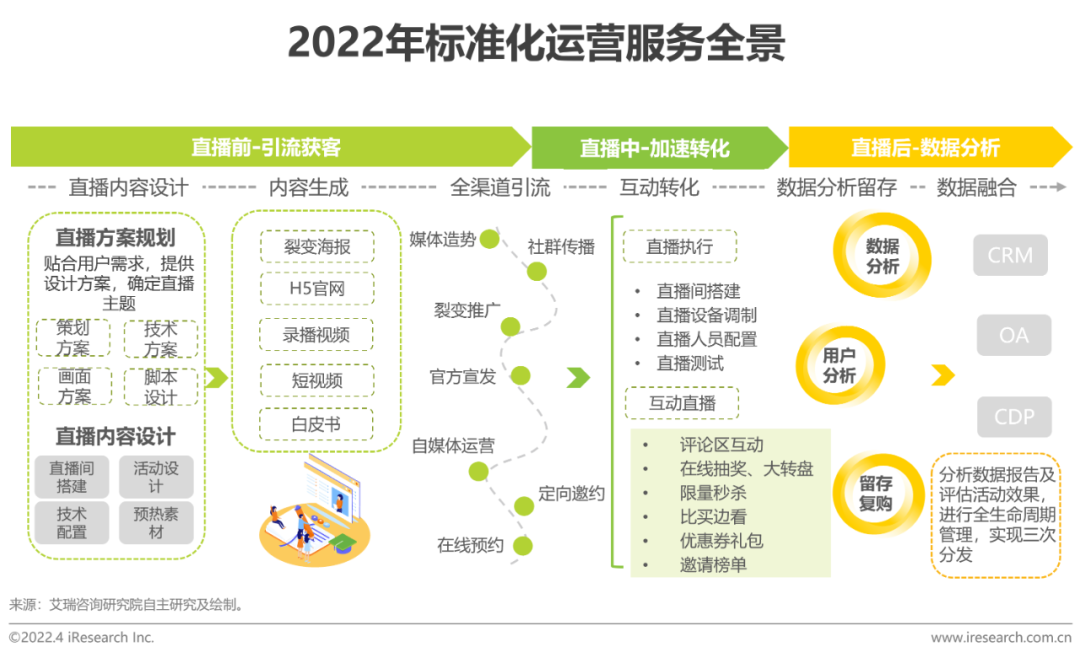 近些年,企业直播服务商通过产品硬实力+行业丰富经验,全方位的为客户提供一站式的解决方案。企业直播服务商聚焦直播场景,通过直播前数据采集,延展全方位的活动策划推广服务,凸显品牌价值;直播中数据激活,提供专项的团队全周期的运营服务,针对企业开播情况和层级问题开展培训让企业操作更加简单便捷;此外,直播后数据后台通过用户轨迹研究、数据分析立体呈现用户画像及路径,帮助企业精准获客。通过直播工具、策划、执行、运营打造的全链条服务是企业未来选择服务商时的重要考量因素。