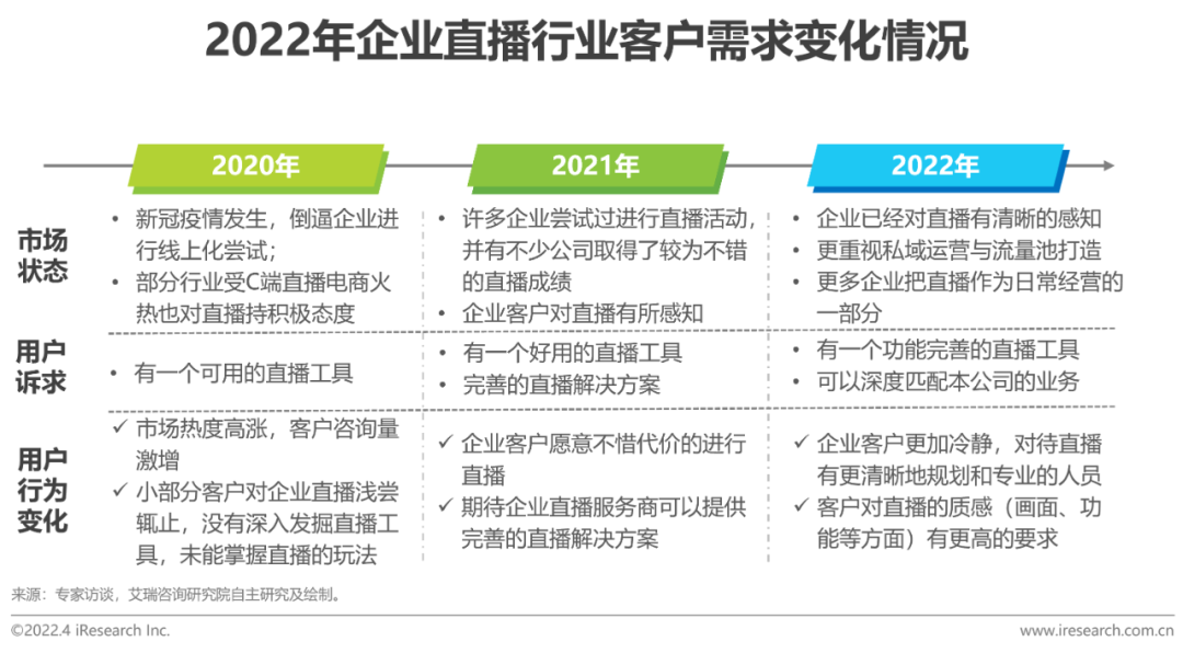 2020年初新冠疫情的突然到来迫使企业线下活动停摆,日常运营受到挑战,企业线上化需求迫切。彼时,C端电商直播的火热让许多B端企业对于直播形式有所期待。这一阶段的企业用户开始尝试企业直播新形式,促使整个企业直播行业迎来爆发式增长。然而,此时部分企业不懂直播运营,因此一批客户在这一阶段短暂的尝试后便选择放弃。2021年,部分企业通过成功的直播带来了业绩的巨大增长,市场对直播的认识更加清晰,企业客户开始寻求能提供完善直播解决方案的服务商,并开始探索直播工具的新玩法。进入2022年,企业客户对直播工具了解进一步加深,并明确自身适合何种直播,更关注直播工具与自身业务深度匹配的能力,同时对直播的质感需求也进一步提高。