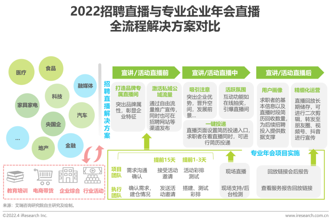 针对不同赛道提供个性化解决方案是未来企业直播关注的核心点。在标准化解决方案的基础上,针对不同行业特点加入个性化调整,打造适合企业的专属方案。以细分赛道企业招聘市场和专业年会为例,服务商根据招聘市场的特殊性,通过宣讲前的打造专属直播间、激活流量,直播中的个性化活动玩法、一键投递,到直播后的建立用户画像及精细化运营。针对于专业大型年会企业直播服务商通过丰富的营销互动功能、专业的硬件设备、直播现场全流程执行、内容多平台分发推广打造专业年会直播执行一站式服务。未来,服务商通过在服务周期不同阶段进行个性化方案调整,通过洞察新的应用场景赋能出更多样化的解决方案提升客户满意度。