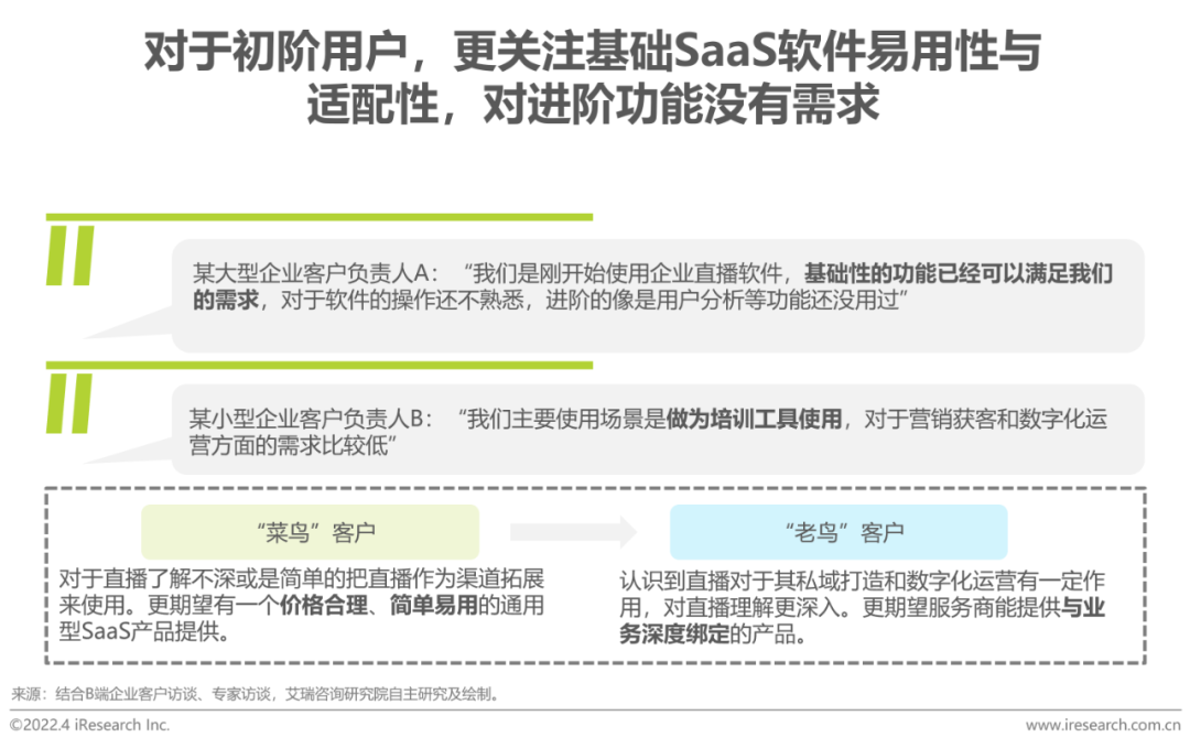 经过前两年的洗礼,B端企业客户对直播的需求更加明确,企业客户对于直播的服务需求也开始出现分化。一方面,部分偏传统行业或新接触企业直播的企业客户,对于直播是一种“浅需求”的状态,将直播更多的还是视作一条线上渠道拓展,日常使用的更多的也是基础性的功能。此类客户其实对进阶功能的需求很低,更渴望获得一个低价质优的通用型SaaS产品即可。另一方面,部分注重私域流量池打造与数据化运营的企业客户对于直播的重视程度在增加,对于直播产品的前后端服务也提出了更高的要求。而这种企业客户需求的分化,也为企业直播服务商带来了新的行业机会。