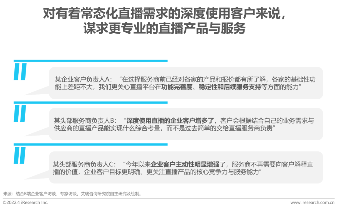 客户专业性增强、需求分化:随着企业客户对直播感知越发清晰,未来更加关注深度绑定能力