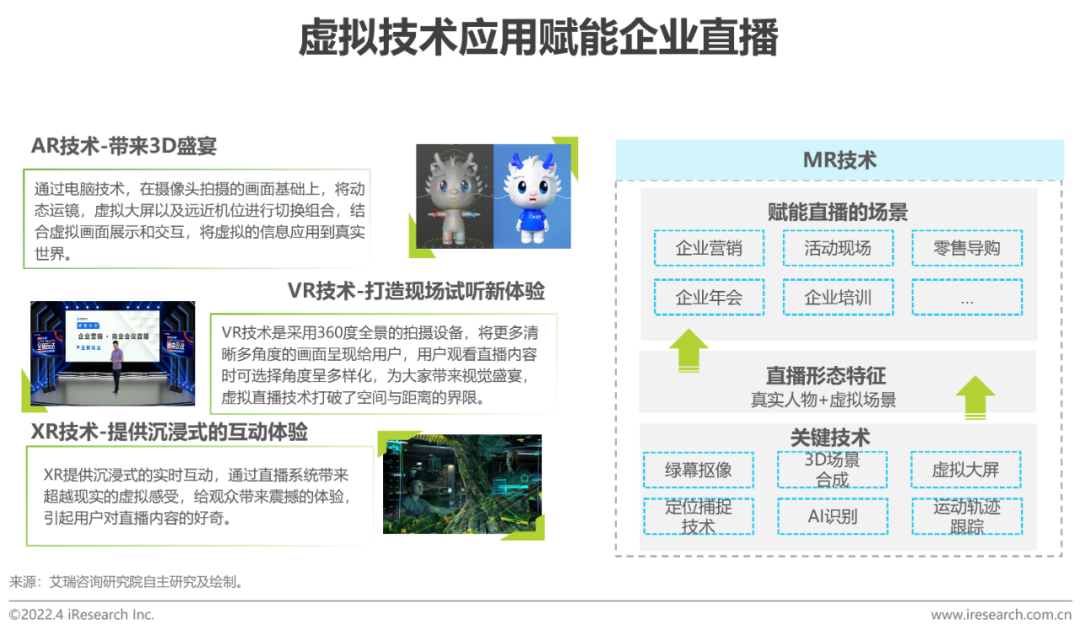 虚拟技术正在驱动传统视频直播形式的变革。通过AI结合创新技术的应用,打造了视、听、触多维融合的空间。3D技术打造企业虚拟新形象,利用全景拍摄技术打造现场试听新体验,直播场景突出视觉交互技术的融合,实现虚拟世界与现实世界无缝转换。AR、VR、XR等技术,让虚拟世界越来越逼真,在虚拟的空间里,产生真实的互动,而对于企业直播来说,为用户呈现一场沉浸式的虚拟直播,是企业营销中的重要因素。同时,MR直播强调真实人物与虚拟环境的叠加,不局限于特定场景,极大改善企业直播用户体验的效果,拓展企业直播应用场景。