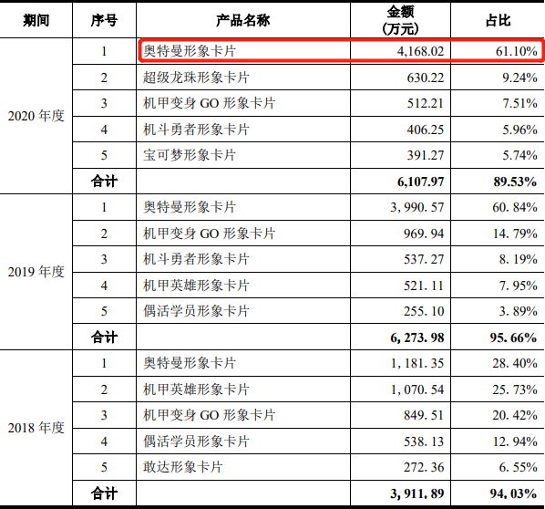 从具体收入来看,2018—2020年三年间,公司动漫IP主要衍生产品收入从3911万元增长至6107万元,而在这之中,奥特曼形象卡片的年销售额最高可达4168万元,比其他几类卡片的销量总和还要高出数倍,这足以说明,奥特曼形象已经深入消费者心智,并能够为品牌创造出不可估量的价值。