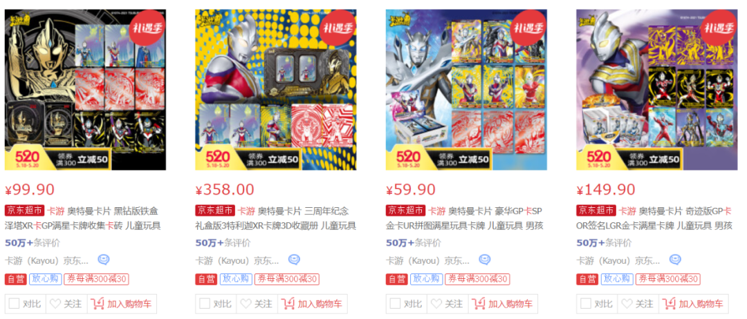 作为一家刚刚成立三年的公司,卡游拥有奥特曼等国内外70%以上的动漫IP授权,并在国内卡牌市场占据近90%份额,在京东平台的卡游官方旗舰店里,列数排位靠前的单品,基本每个商品都有50万+条评价,这样的发展势头,不可谓不迅猛。