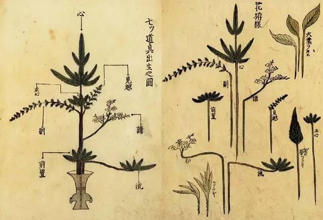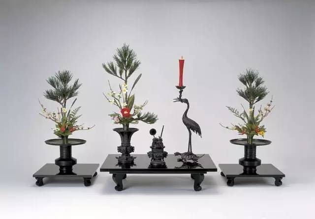 花色、质感的不同搭配,各流派都有详尽的规定与格式。主要分为「立花、生花、自由花」三种,基本区分主材与副材。佛教而来的供花习俗,作为供品的三枝花茎呈简单的对称排列。