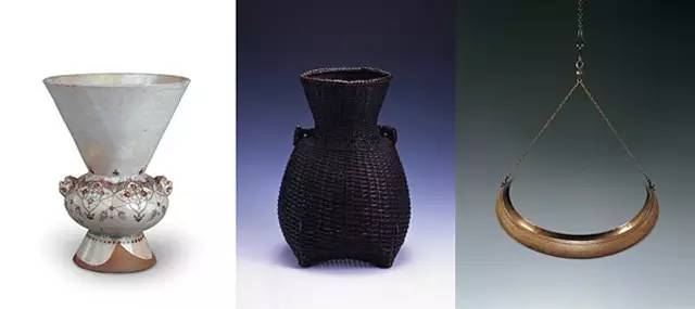 ▲ 花器,从左至右依次为:色绘璎珞文花生,唐物竹组木耳笼花入,砂张舟花生铭淡路屋舟