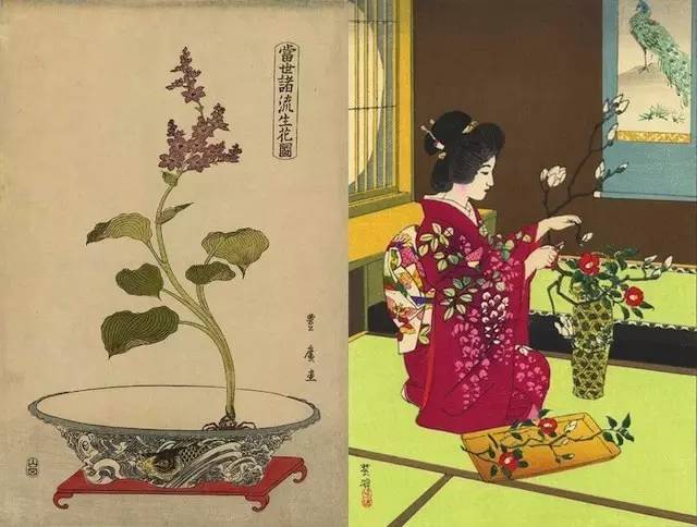 ▲ 左图:「当世诸流生花图」,歌川豊廣;右图:笠松紫朗
