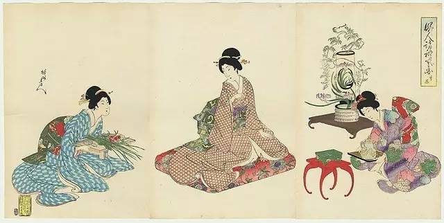 江户时代社会祥和,经济发展。曾为僧侣贵族间盛行的花道随茶汤流行,于是出现了「生花」取「生命之花」的本意,造型简洁,受到大众的青睐。生花造型虽显刻板,但却采用了基于不对称造型构图。