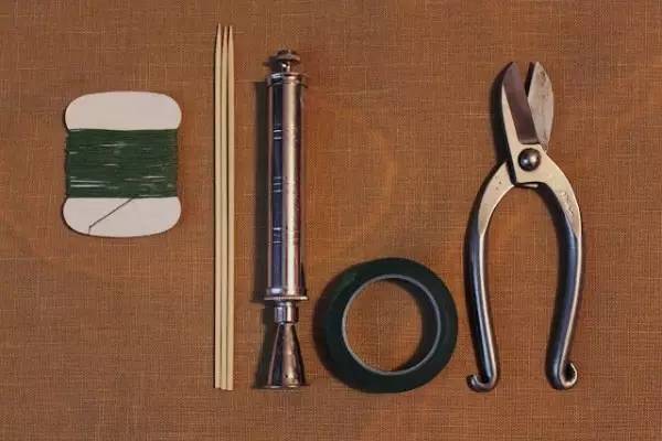 采摘修剪的工具自然也不可轻视,蕨手小剪是必备的工具之一,剪背处卷曲形如蕨菜因而得名;花台以白木漆涂为好;剑山自不必说,1cm左右高的长钉从略重的铅块中冒尖儿,用来固定花枝,长形、方形、圆形多样以调节不同花植;除此,锯、槌、刀等利器也很常用,小品也罢若是遇到大作,电钻,电锯这类生猛的家伙什儿也一并登场,全无了花带来的优雅联想。