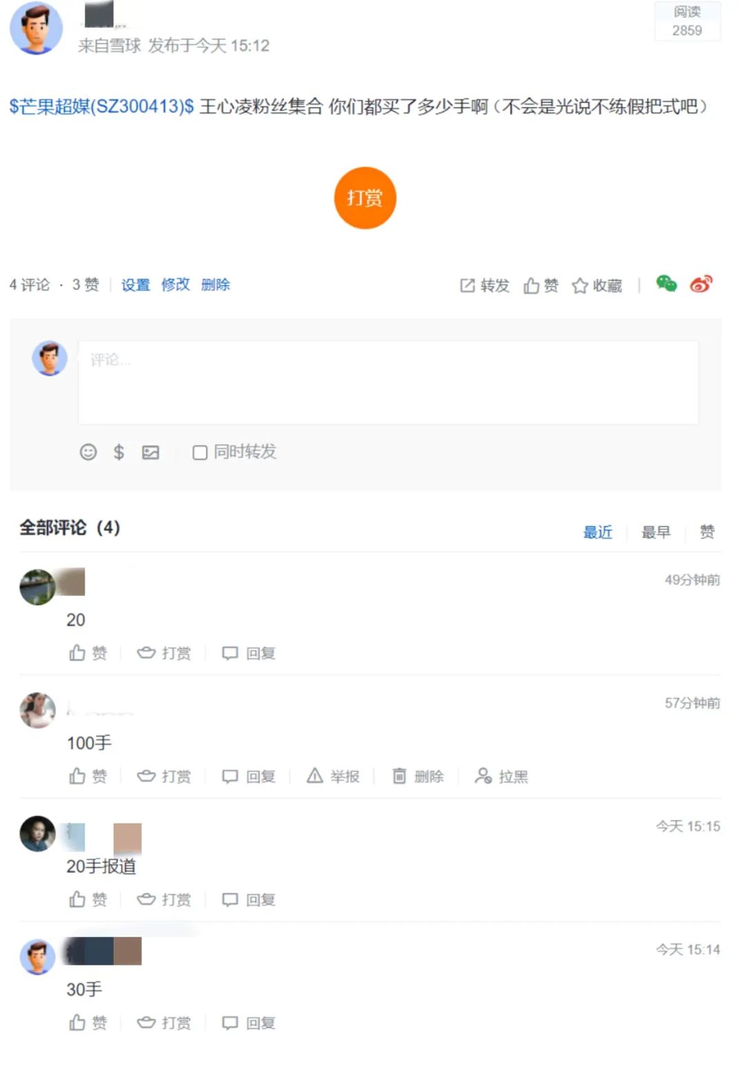 在雪球网上,一些自认“王心凌粉丝”的股民称,自己入了20手、30手不等,也有人还晒出了自己的购买记录,只为能让芒果看到“王心凌男孩”的购买力,并且保她C位。