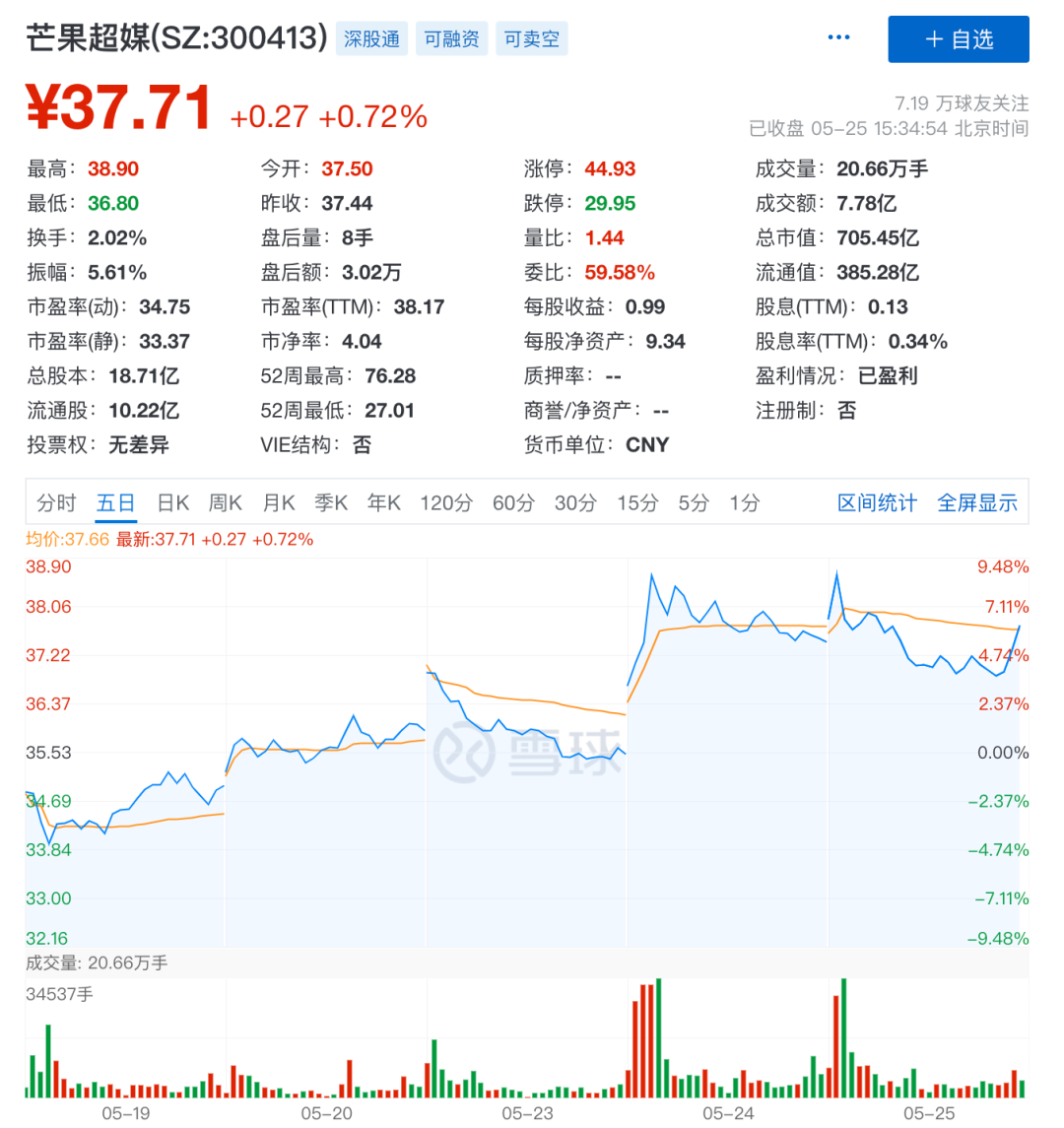 雪球网显示,5月24日,芒果超媒收盘价达到37.44元,较前一日收盘价涨幅为5.46%,而当日最高涨幅曾一度飙升了10个点,同时,27.95万手的成交量较平时实现了迅猛增长,甚至超过了同日爱奇艺的1440.77万股。