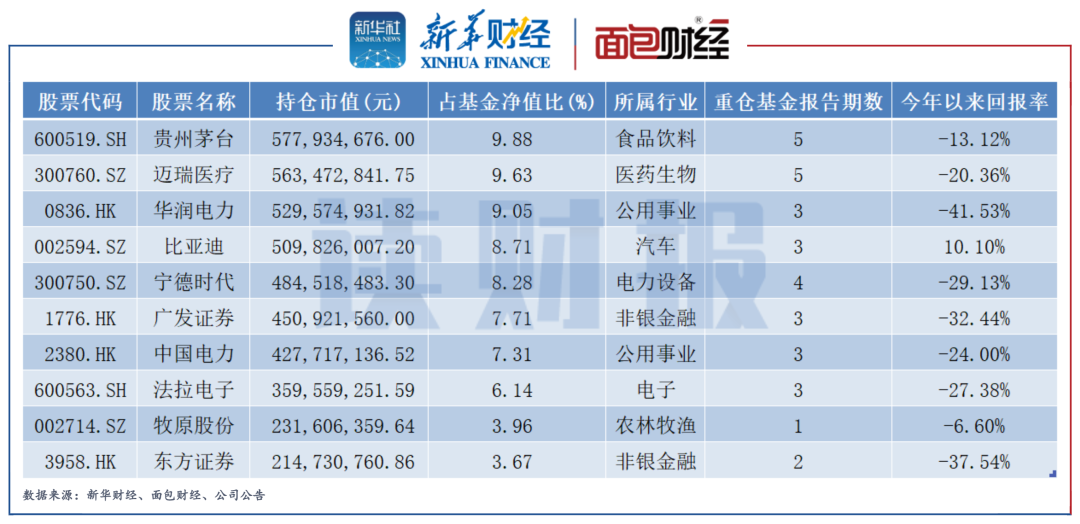 具体持仓来看,该基金重点配置了A股和港股中食品饮料、新能源、医疗、金融、电力运营等方向的头部标的,其中贵州茅台、迈瑞医疗两只股票从成立以来一直持有,当前持仓比例均接近基金资产净值的10%。