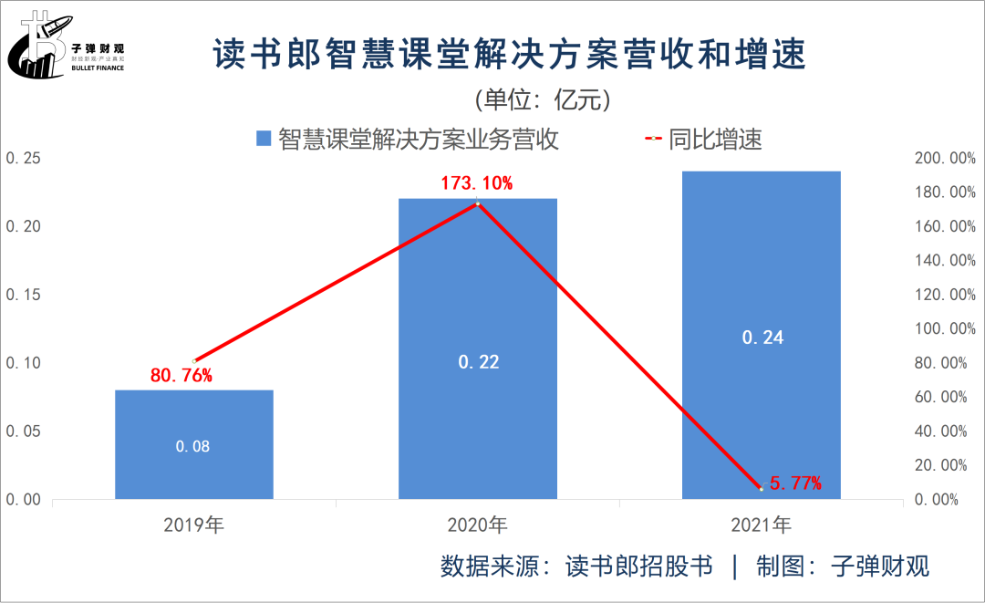 而且,此前两个年度读书郎智慧课堂解决方案业务的营收增速均为正值,且呈逐年加快的势头,分别为80.76%和173.10%。