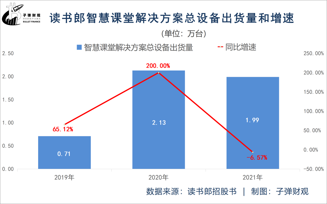 据读书郎招股书显示,2021年该公司的智慧课堂解决方案总设备出货量为1.99万台,较上年同期的2.13万台减少6.57%。