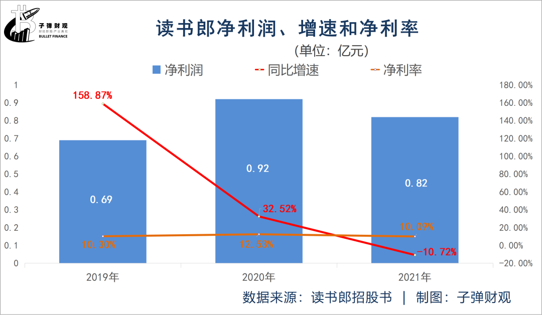 而毛利润的下降,直接影响了读书郎的净利润。读书郎披露的招股书信息显示,2021年该公司的净利润为0.82亿元,较上年同期的0.92亿元下滑10.72%。